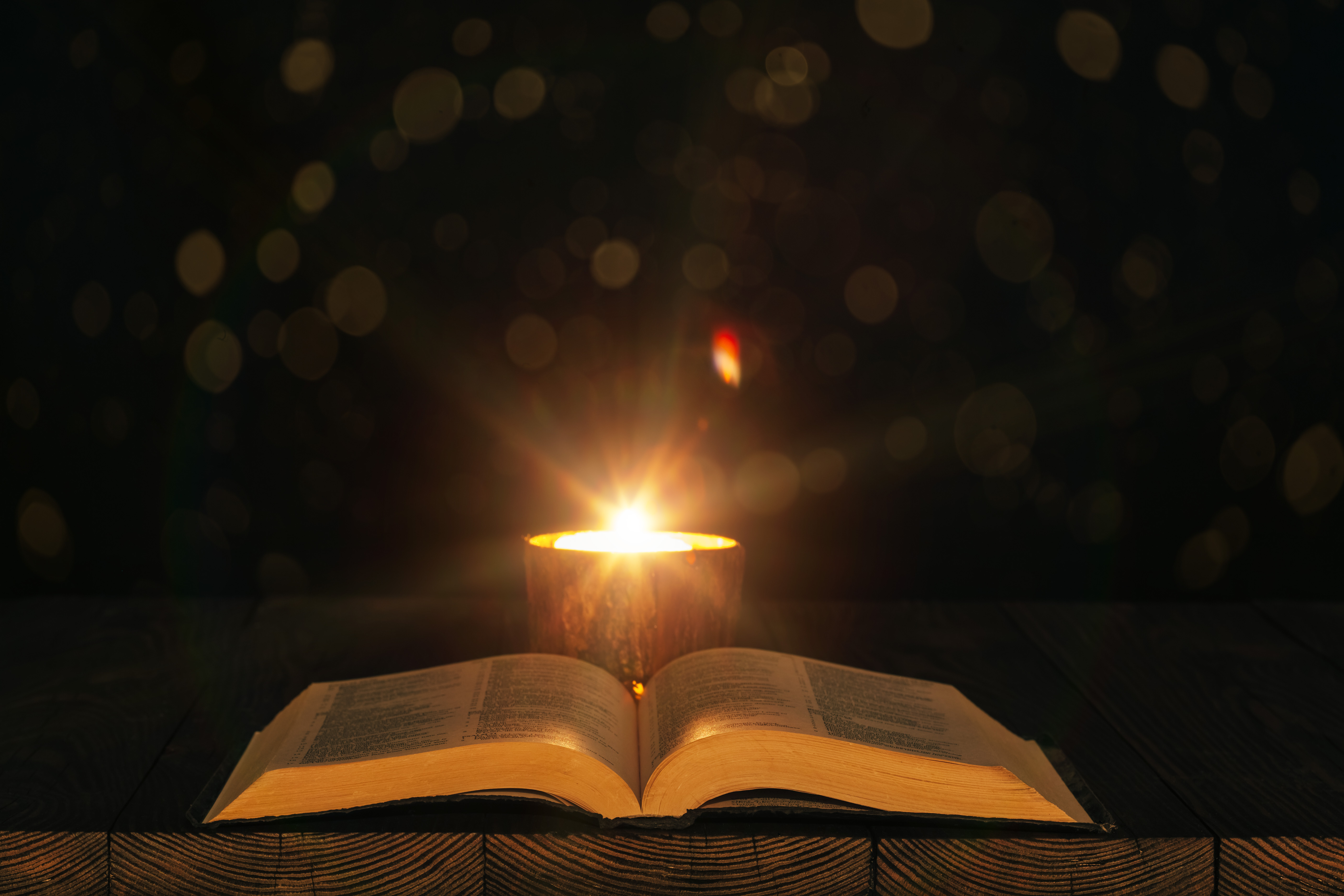 bible on the table in the light of a candle
